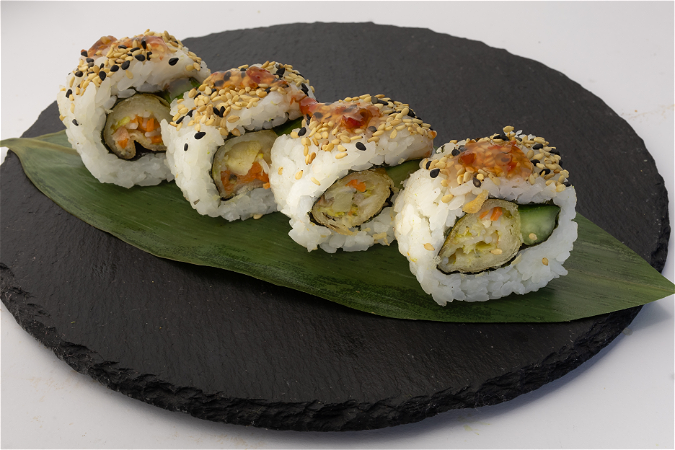 Wortel, komkommer, edamame, avocado, teriyaki, mayo, ebi en sesam